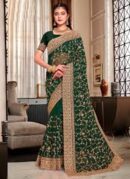 Features heavy golden zari work, intricate motifs, and a grand pallu